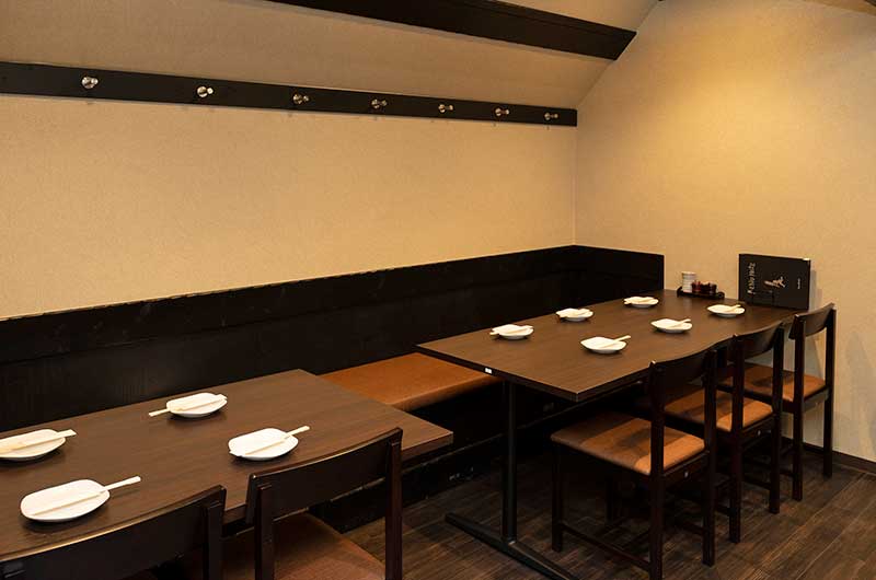 当店には、4名個室が2部屋、6名個室が2部屋、計4部屋の完全個室があり、プライベートな会食や接待にもってこい。店内はゆったりとした広さで、通常テーブル席でも落ち着いた雰囲気でお食事が可能です。カウンタ―はありませんが、お一人様でのご来店も大歓迎!ぜひ、美味しい串焼きとお酒で日常の疲れを癒してください。